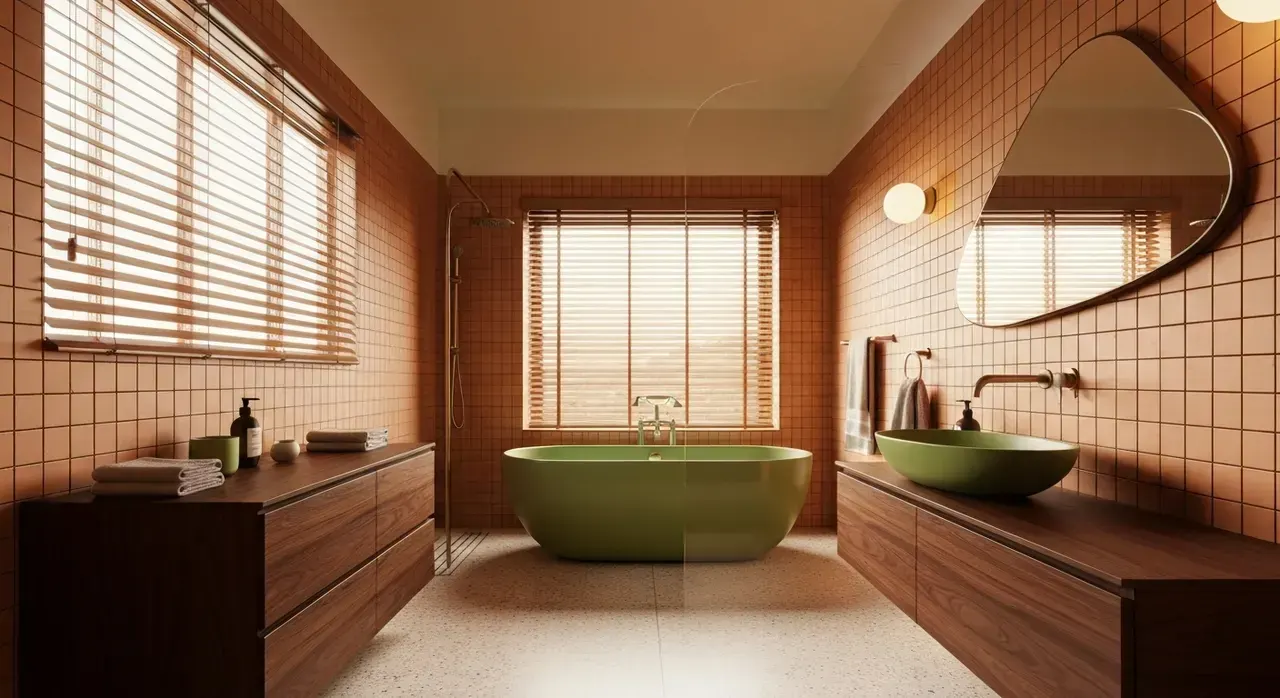 Het kleurenpalet is de ziel van de 70s interieur badkamer. Het draait om een palet dat geïnspireerd is op de natuur: warme, aardse tinten die rust en comfort uitstralen. Deze kleuren werken samen om een gelaagde, uitnodigende en organische sfeer te creëren die perfect past bij de retro esthetiek. Hierbij presenteren we een zorgvuldig samengesteld palet, inclusief de psychologie achter elke kleur en praktische toepassingen.