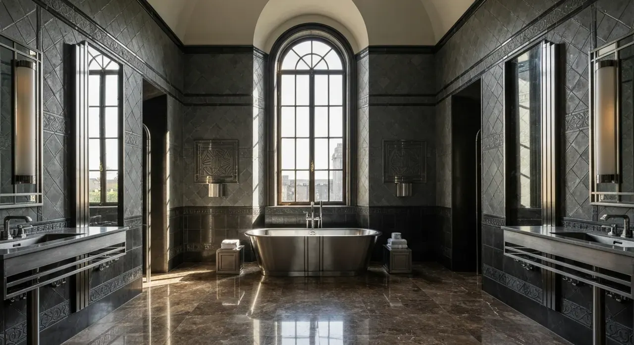 Een Art Deco badkamer is direct herkenbaar aan zijn distinctieve kenmerken.