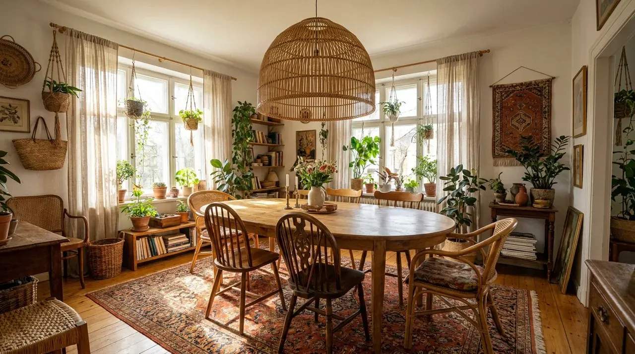 De meubelkeuze in een Bohemian eetkamer is doorslaggevend voor de sfeer.