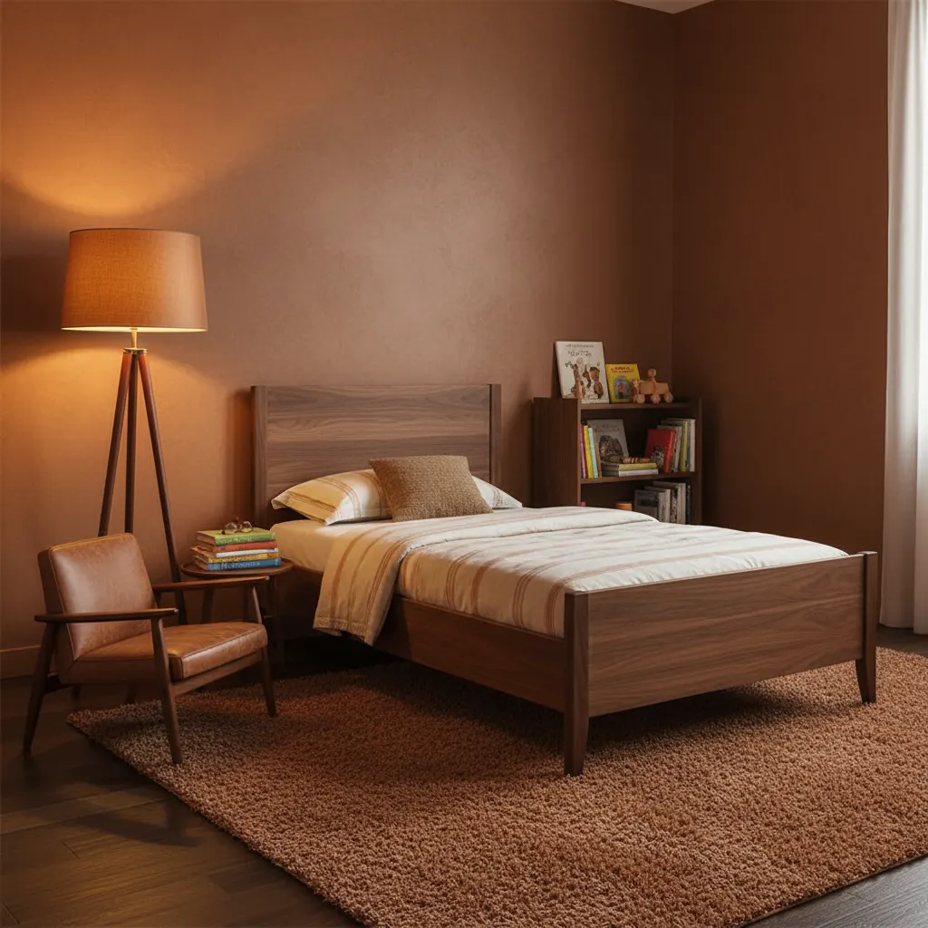 Kies het ledikant/kinderbed, de commode en de kledingkast van massief hout in een warme, donkere tint zoals walnoot of donker eiken. Let op de mid-century vormen: afgeronde hoeken en taps toelopende poten. Zorg dat de meubels functioneel en veilig zijn. - Stap 3: Voeg Zachte Texturen toe met Stoffering en Vloerbedekking