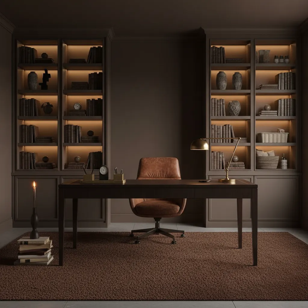 Een vloerkleed is een must in een Bold Coffee werkkamer. Het definieert de ruimte, voegt akoestiek toe en brengt warmte onder je voeten. Kies voor een grof geweven wollen vloerkleed in een diepe bruintint, mokka of een subtiel patroon. Sisal of jute, hoewel lichter van kleur, kan ook werken als de textuur ruig genoeg is. Een vintage Perzisch tapijt met gedempte roestbruine en donkerblauwe tinten kan een eclectische, luxe twist geven. Plaats het kleed zo dat het bureau en de bureaustoel er deels op staan, om de werkzone te verankeren.